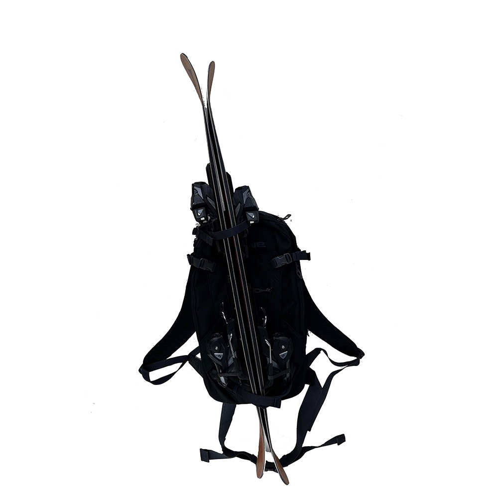 Strap your skiboards to this pack to carry. Vertical and diagonal straps are attached. This is a pretty slick pack, small enough to not encumber you on your adventures, but has all you need for a day of fun. Outside pocket for incidentals, inner pack with elastic pocket for water bladder. also has a padded and zippered goggle pocket and outside stretchable compartment to carry helmet, gloves, etc.